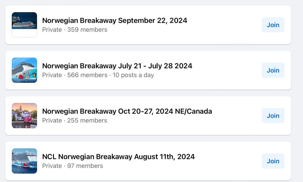 Example of Facebook groups for people who are going to travel on the same ship on the same day